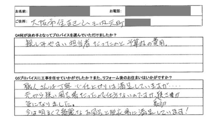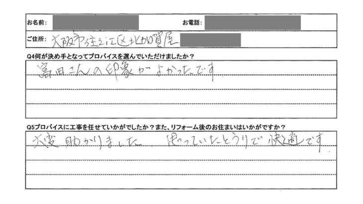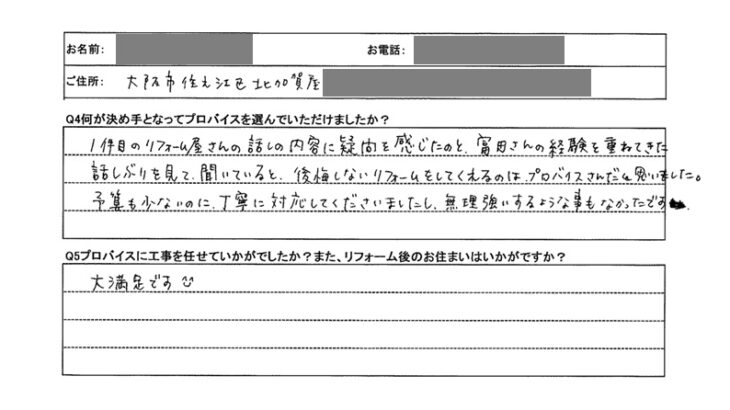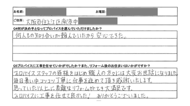 K様は「費用と日程」でお悩みでした。プロバイスを選んで頂いた理由として、「親しみやすい担当者だったのと予算内の費用だったため。」とのお言葉を頂いております。 以下、工事をさせて頂いた後の「お客様の声」 […]
