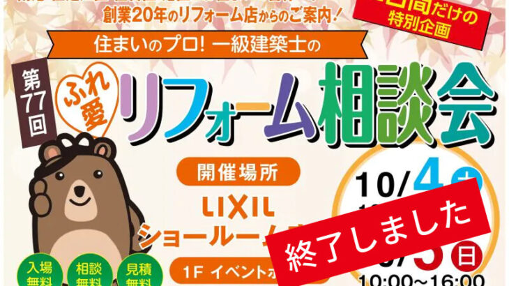 来たる令和7年10月4日・10月5日の土日の2日間、LIXILショールーム南港にて、ふれ愛イベントを開催します!リフォームをお考えの皆さま、是非この機会にご参加ください! 【会場】LIXILショールー […]
