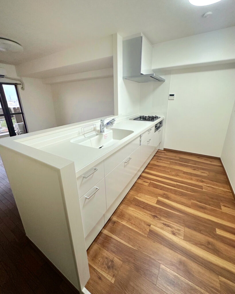 内装工事では、キッチンの印象を一層引き立てるために、フローリングを張り替えました。真っ白なキッチンと相性の良いフローリングを選ぶことで、全体的に明るく清潔感のある空間を演出。料理をするのが待ち遠しくなる、そんな素敵なキッチンに仕上がりました。